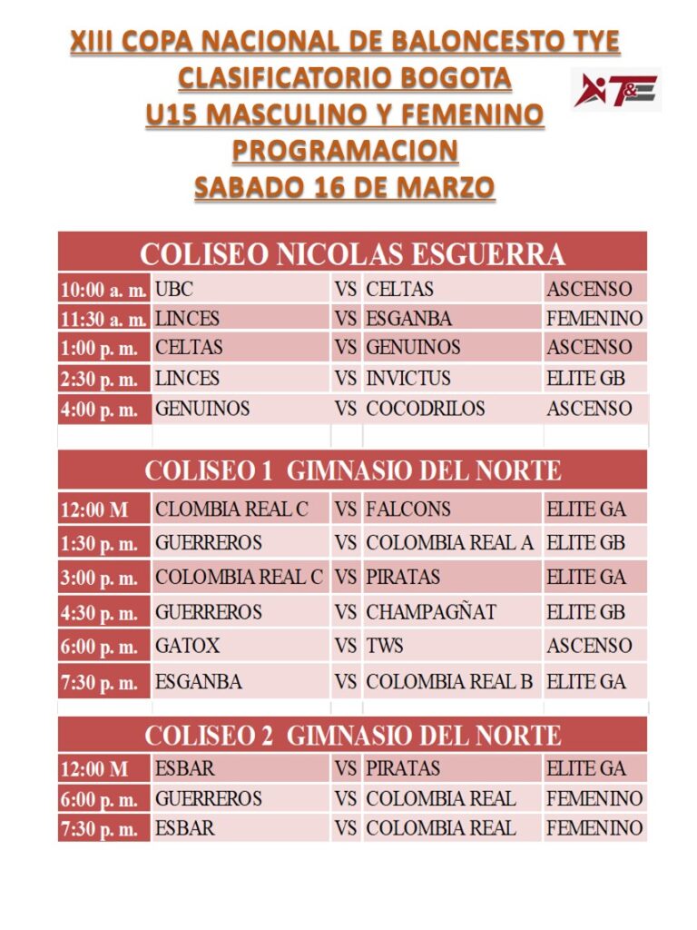 Sábado. Por el torneo de la Liga de Baloncesto de Bogotá (LBB) en el coliseo Cometas (TWS A) a las 02:00 pm y en el coliseo Cayetano Cañizares (TWS B) a las 06:30 pm.